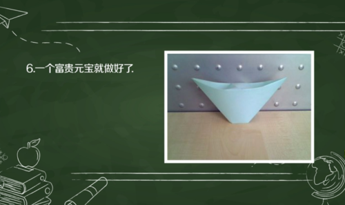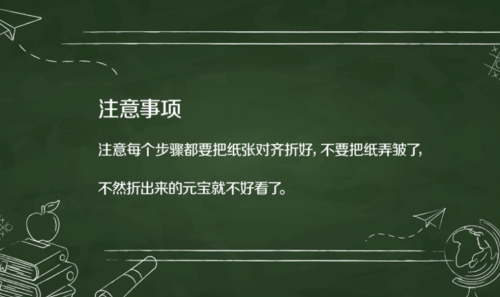 7注意事项:每个步骤都要把纸张对齐折好,不要把纸弄皱,不然折出来的元宝不好看。END