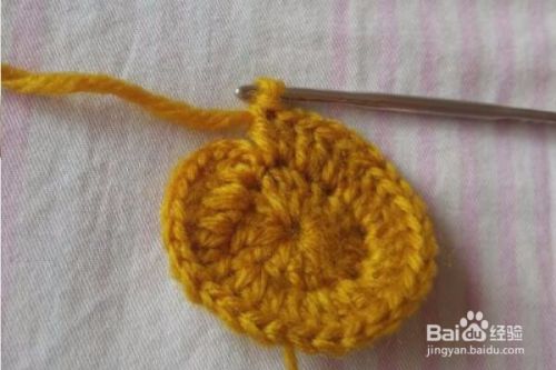 第2圈的编织方法:起3个辫子针,然后在每一个辫子针里面各钩2个长针,同样最后一针与第一针做引拔针连接,这样第2圈就钩织好了。
