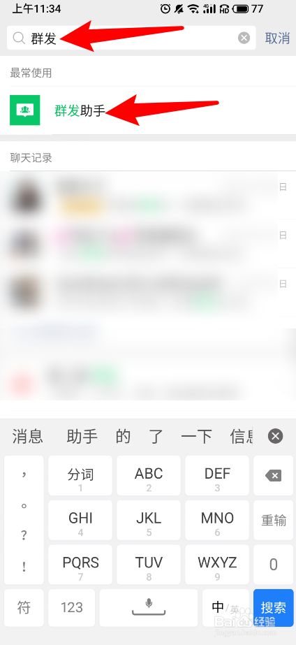 随后在搜索里输入群发并点击群发助手进入。