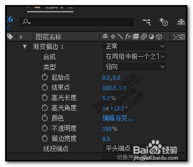 看,合成窗口这里,圆形与星形即同时显示出了与矩形一样的渐变描边了。