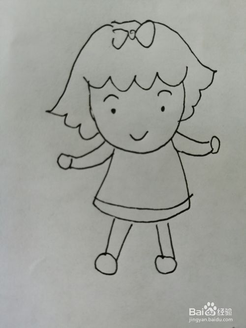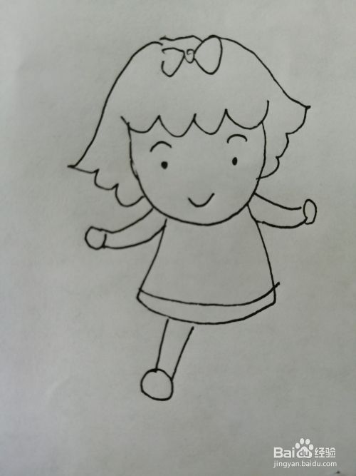第七步,最后把小女孩的两只腿画出来。简笔画小女孩就画好了。