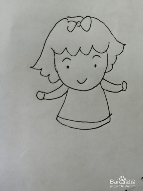 第六步,接着在小裙子和头部连接的地方画出两只可爱的小手。