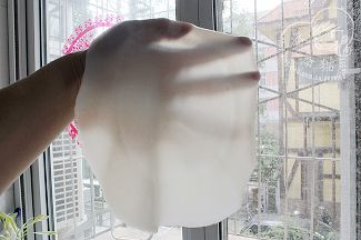 12面皮稍凉后可从盘中揭下。蒸好的面皮是半透明的,很有韧性。如图: