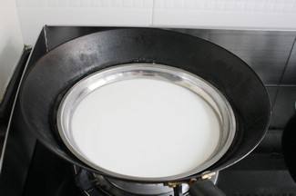 10在平盘里倒一勺面水,放入已经烧开水的锅中,盖上锅盖隔水煮三分钟左右,面皮的薄厚自己掌握。如图: