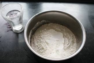 1在一斤面粉里加入三克左右的盐,兑上凉水和面,面可以和得硬一点。如图:
