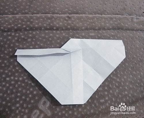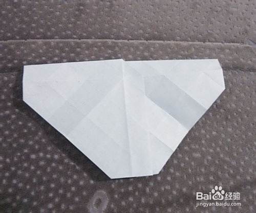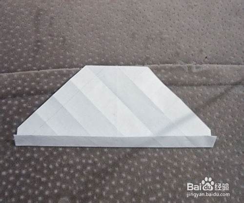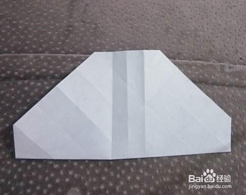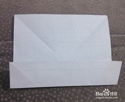 横向对称折叠,叠成一个三角形,如图所示,将三角形的小角进行向上折叠,此处就折叠一个小方格大小就可以。