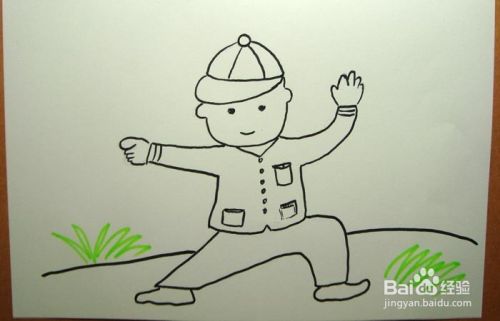 最后用黑色的水彩笔画出小男孩的背景,在公园的绿色草地上练习,如下图所示。这样一个练习武术的小孩,就画好了。