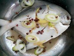 3.用盐、糖、料酒、葱花、姜丝、花椒把平鱼腌制30分钟。