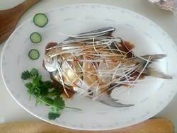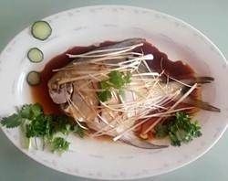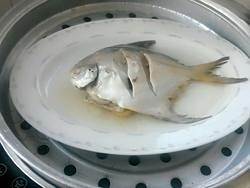 7.把盘子中的水份倒掉,姜片取出,把葱丝散放在平鱼上,倒上适量蒸鱼豉油。