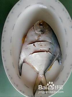 4.用姜片垫底,把平鱼放入盘子上。