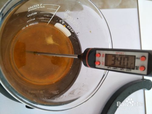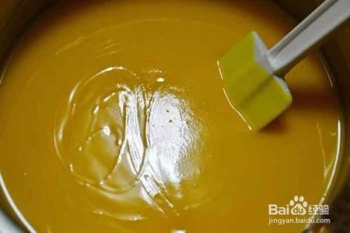 将苛性钠水匀速倒入基础油中,顺时针搅拌,观察稠化程度。当皂液达到酸奶状即可,甚至在上面写一个8字,也不要过几秒消失。
