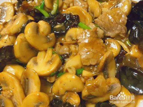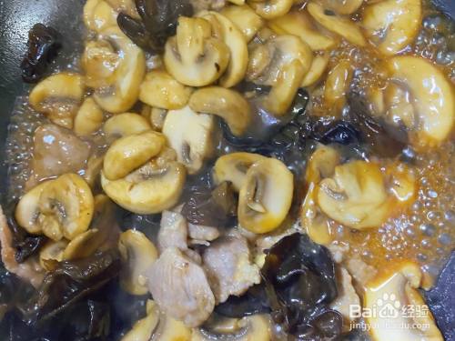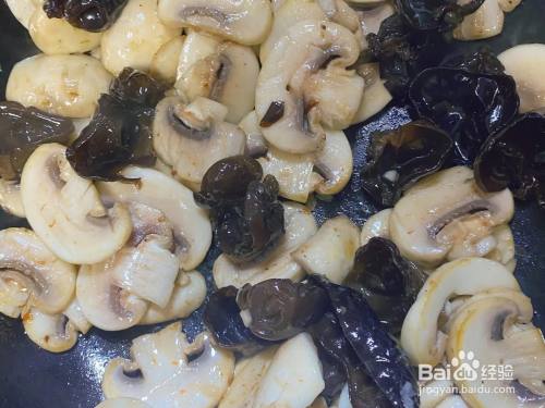 油锅热了以后,将口蘑和木耳倒入翻炒,至蘑菇微微起焦。