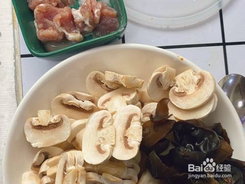 将蘑菇切片,准备好木耳4朵,适量肉片。