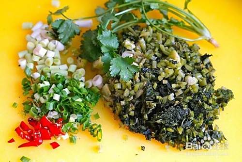 将雪菜切碎碎的,再将辣椒、葱、蒜再分别切好备用。冬天少吃辣不会上火,所以我只切了2个辣椒,如果无辣不欢,可以自己多放一点辣椒。