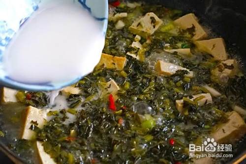 将淀粉加入半碗凉水搅拌均匀,然后倒入锅中勾芡。加了淀粉水勾芡,可以让这道菜口感更加滑嫩美味。注意:如果雪菜不是太咸,可以在此时再另外加入一点盐。