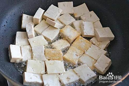 热锅热油,倒入豆腐块煎1分钟,然后翻过来再煎另一面。