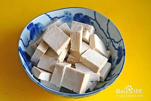 准备好以上食材后,将豆腐切成小块备用。豆腐我更喜欢用嫩豆腐,豆腥味小,又水嫩好吃。如果你喜欢老豆腐,也可以换成老豆腐。