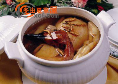 3将鸭肉顺颈劈开,取冬虫夏草8~10个放入鸭头内,再用棉线缠紧,余下的冬虫夏草和姜,葱白一起装入鸭腹内,然后放入器皿中,注入适量清汤,用盐、胡椒粉、料酒调好味,用湿棉纸封严口,上笼蒸约2小时。