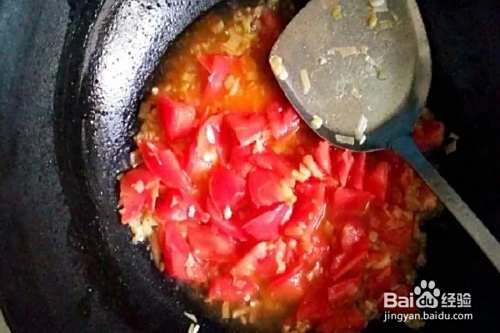 炒锅中放入少许油,中火烧热,依次倒入姜、蒜、大葱的葱白部分炒出香味,再放入西红柿翻炒。