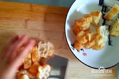 首先把油条切成小段,长度大约1.5-2厘米,装入盘中备用。