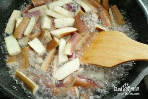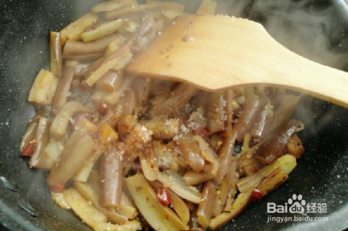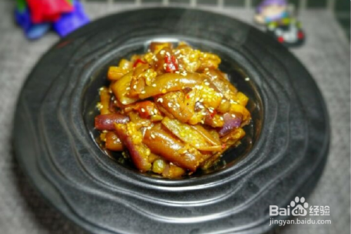 热锅烧油,放入牛肉酱炒香,放入茄子煸炒,炒匀后放入干红辣椒、白糖、盐、生抽、耗油。