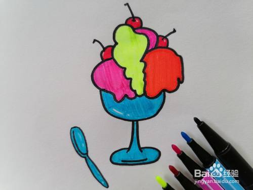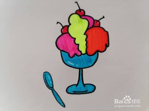 在最顶部画几颗樱桃果子,在左边画一个小勺子