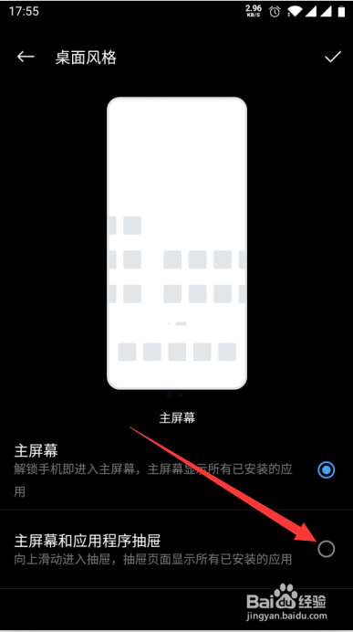 第4步进入桌面风格中后,我们在桌面风格中选择你需要设置的风格,这里有主屏幕风格和主屏幕,应用程序,抽屉风格两种,这里选择下面一种。