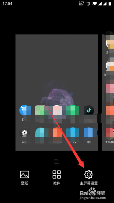 第2步进入到主屏幕后,我们在主屏幕中长按主屏幕中的空白区域,然后可以看到下方的三个弹框按钮。这里选择主屏幕设置。