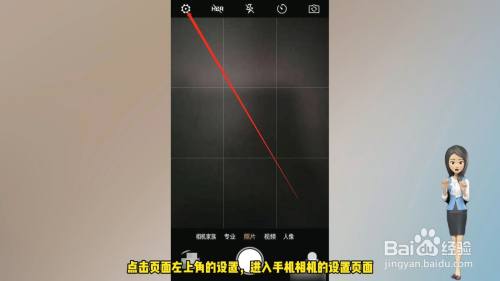 进入手机相机拍照页面后,点击页面左上角的设置,进入手机相机的设置页面。