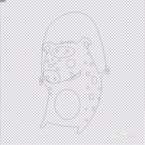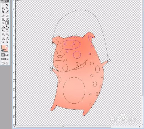 选择钢笔工具,我们把小猪的动作用钢笔一一呈现出来,在细节的绘制方面主要体现在身体表面上的各个不同色调的圆形花纹,还有小猪夸张的表情,这些都要用路径一一呈现出来。
