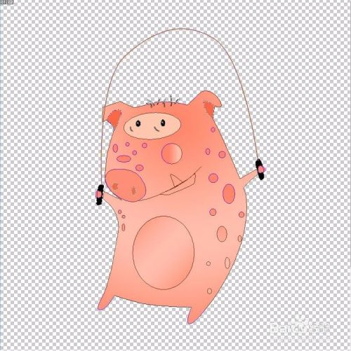设置前景色为黑色,我们对于小猪的眉毛,头顶的鬃毛进行一个描边,设置前景色为棕色,我们对于小猪的跳绳进行一个描边。用粉色的渐变把小猪的两只在跳绳手柄上的小手也绘制出来。合并所有的小猪图层,做一个浮雕效果,再给图片增添一个白色的背景,小猪卡通图片设计完成。