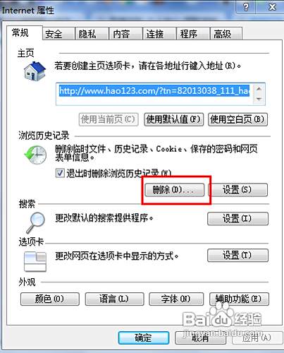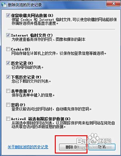 在如下的界面中点击删除键。上面的那些小方框最好不要随便点击,可能会使你的浏览器无法正常使用。只用推荐的选项就好了。