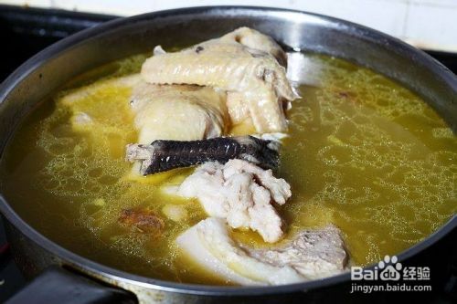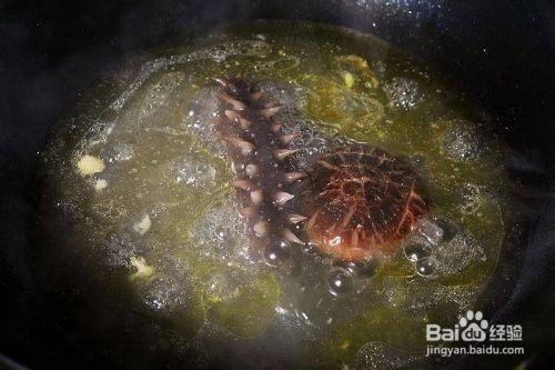 将发透的椴木花菇和海参放入一不锈钢锅中,倒入熬好的鸡汤,锅煮开后转小火焖制10分钟关火