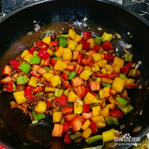 这时,可以放胡椒粉,翻炒均匀,放半勺盐,一勺糖,这时,你不能偷懒,你一定要经常翻炒才能尝到更好的味道。