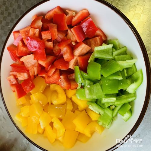 准备切成小方块,将柿子椒从中间切下,去掉花椒的核,然后如图所示切下,最后切成小方块,这就是切每一个的方法。