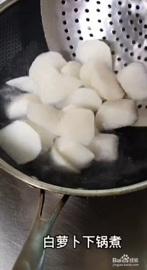 第二步,白萝卜下锅煮。羊肉下载汤锅里,下生姜,当归。煮开盖起来。