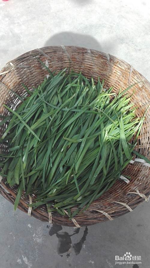 清洗韭菜,最少洗两遍,根部容易存留泥土,清洗要仔细。洗完韭菜晾晒在小筐里,晾晒一下。