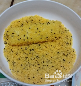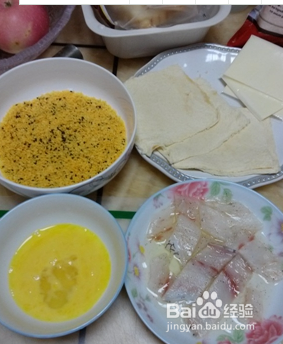 准备好其他材料 鳕鱼切薄条用一点点盐黑胡椒粉和鸡蛋清抓云腌制一会 剩下的蛋黄再打一只鸡蛋 打匀,芝士片三片 面包糠和黑芝麻混合