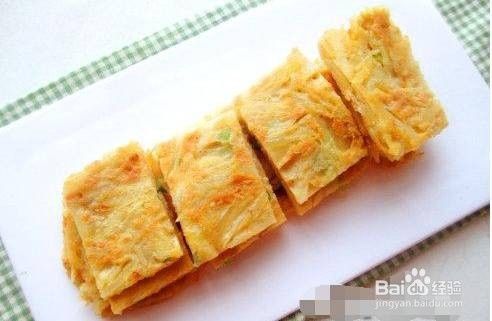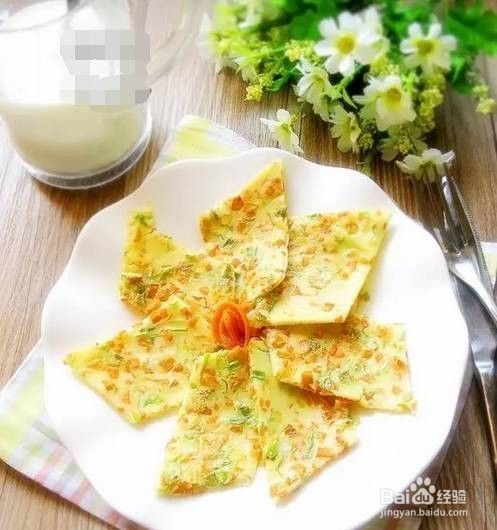 1、 将胡萝卜洗净,切碎,放入锅中,注入沸水,使水刚刚漫过胡萝卜,加入少许白糖,盖锅焖煮15分钟。 2、 将面包去皮,在牛奶里浸片刻,取出,同胡萝卜放在一起,研碎,加入鸡蛋液调匀,做成小饼,上面涂上打成泡沫的蛋清,沾匀面包渣,备用。 3、 将平底锅置火上,放入植物油,烧热,入做好的小饼坯,煎熟即成。煎饼时火不宜太旺,否则饼外糊里生。
