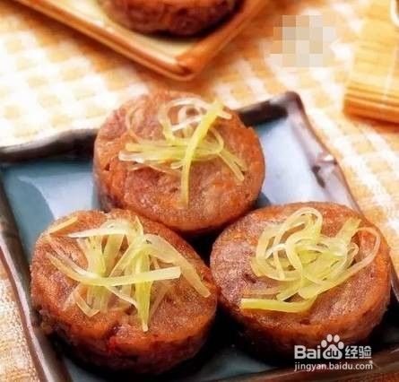 2、取粉团600克,分成20粒,把莲子茸与炸榄肉混合后分成20粒,用粉团分别包入莲茸馅,压扁成圆饼形,面上中心放原粒榄肉1粒(用水粘结,可防煎时脱落)。 3、烧热油镬,放入适量生油,分2次饼放进镬内,煎至呈浅金黄色,再翻另一面,至两面同一色泽,起镬倒在笊篱里,滤去油分,上碟。
