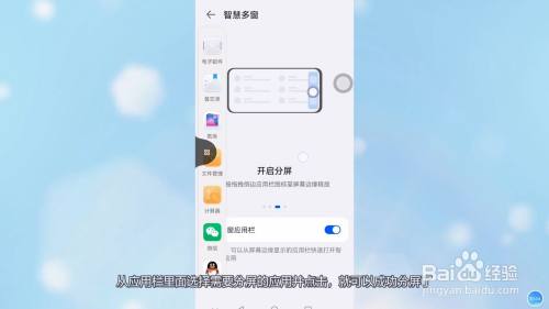 在华为辅助功能里面开启智慧多窗应用栏,调出应用栏选择应用进行分屏即可,以下是详细的操作步骤:
