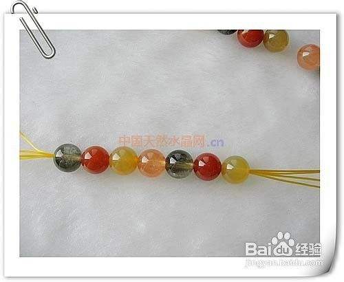 按事先排列好的顺序依次串好(注意:第一颗珠子的孔径选稍大些的,方便收工时候将线头拉入)。如下图