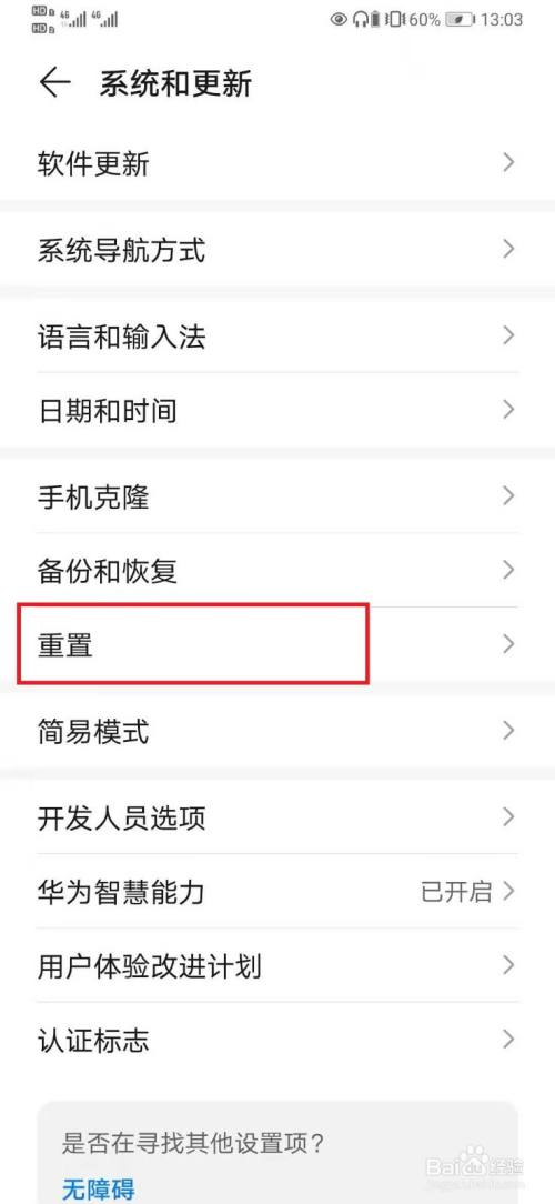 在华为手机上,通过系统和更新的重置设置进行手机恢复出厂设置的方法。
