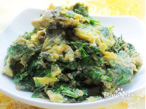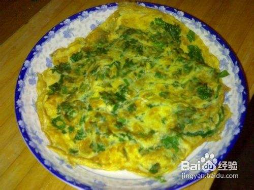 芹菜叶炒鸡蛋:将芹菜叶洗净切碎,鸡蛋磕入碗中打散备用。把切好的芹菜叶放入打散的鸡蛋液里,加盐搅拌均匀。锅里放油,油烧八成热。倒入混合的蛋液,均匀摊开。两面煎至略泛金黄就可以了。