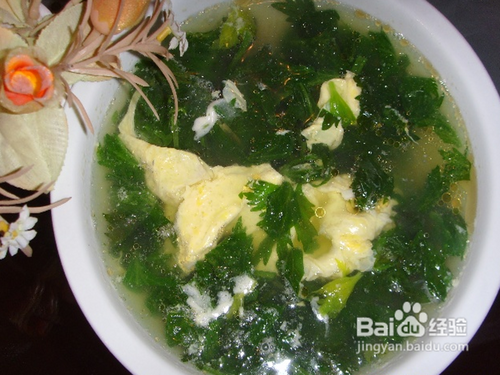 芹菜叶汤:将鸡蛋磕入碗内打碎,锅内加入水,水烧开后放油和盐,放入芹菜叶,煮开后将鸡蛋边搅边淋入锅内,放入鸡精,胡椒粉,关火,淋上香油即可。