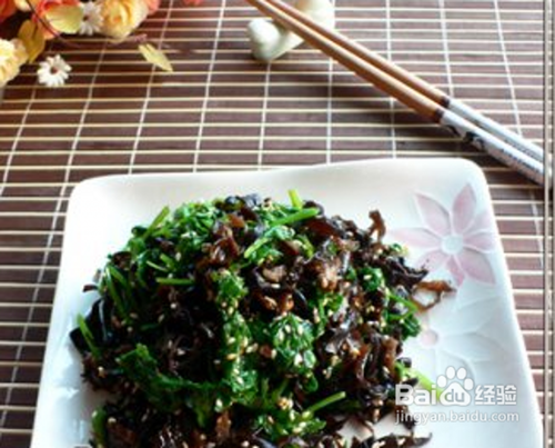木耳拌芹菜叶:将芹菜叶洗净,锅内加入水煮沸,放入少量盐和油,将芹菜叶放入沸水里轻焯一下,捞出淋干水分,切成小段; 将泡发好的黑木耳洗净焯熟,切成细丝; 将芹菜叶、木耳、白芝麻一起放入大碗中,加入适量的盐、花椒油和香油,混合均匀即可。