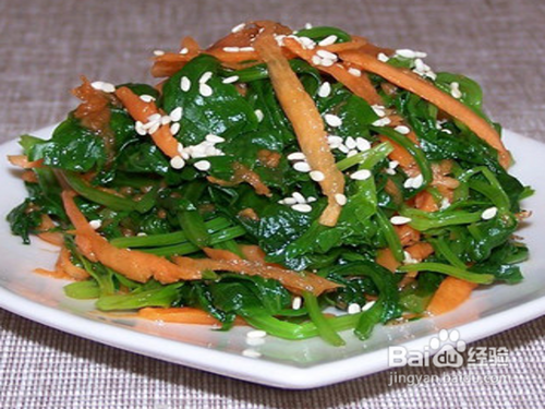 凉拌芹菜叶:将芹菜叶洗净,锅内加入水煮沸,放入少量盐和油,将芹菜叶放入沸水里轻焯一下,胡萝卜洗净切丝也焯一下水,加入点盐、醋、香油、味精、糖、蒜末,搅拌均匀,装盘撒上芝麻即可。