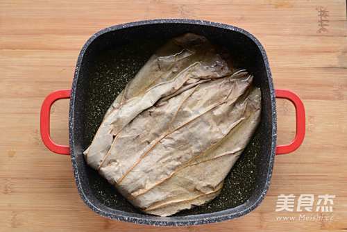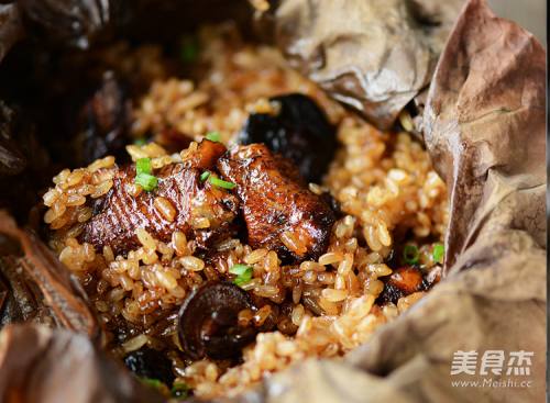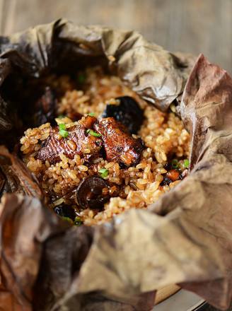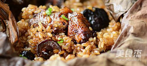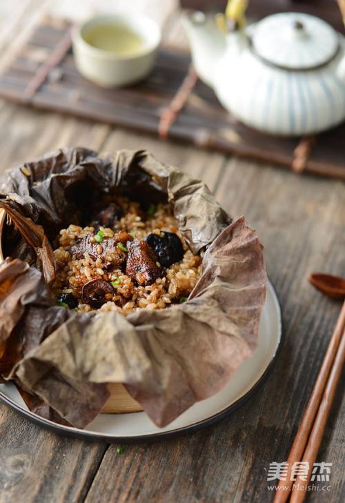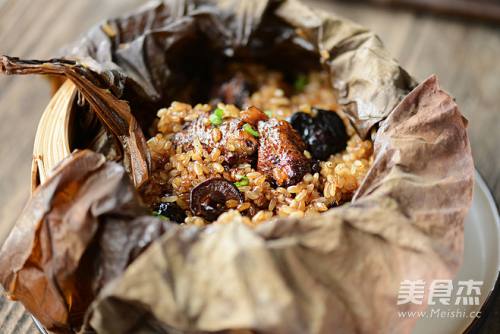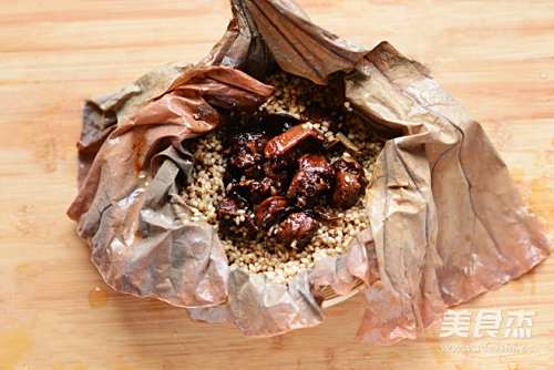 5将糯米用少许生抽、老抽、盐调味后,放入炒好的鸡块,用荷叶将糯米包好,放在小蒸笼中入蒸箱蒸制