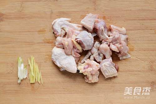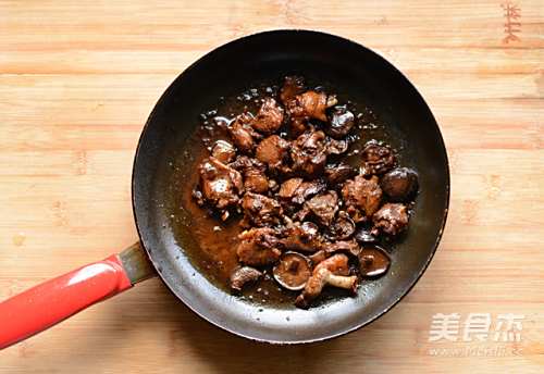 3将食用油烧热后将鸡块放入爆炒,加入生抽、老抽、盐糖调味,加入香叶、香菇和一小碗水焖烧至汤汁收浓稠;