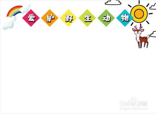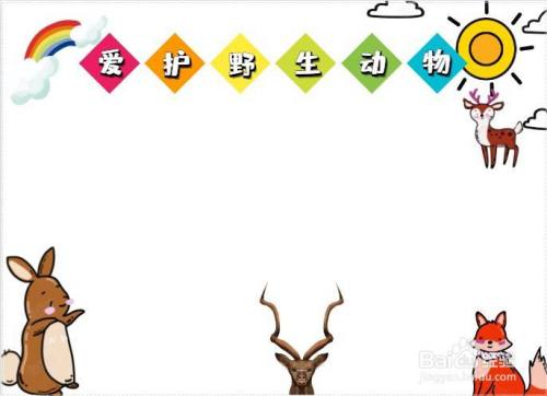 在上方写出报头文字:爱护野生动物,并给每个字画上正方形的边框,涂上彩色。